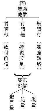 「正信屬佛」。佛經是世尊從真如本性流露出來的言語文字,不是從心意識裡流出來的,所以完全是現量的境界。底下講:「現量」、「比量」、「聖言量」,這是講佛說法的善巧。其實佛的境界,完全是現量,沒有比量;菩薩以下的說法就要用三量。而菩薩當中,見了性的菩薩,大多數也是現量;沒有見性的菩薩,尤其是像我們現在在凡夫位,我們看佛法、討論佛法,是要根據這三個條件。「現量」是眼前的事實道理,大家都承認的,為一般人公認的。「比量」是正確的推理,也能夠為大家所公認的;例如見煙知火,推理得之。「聖言量」:這個理太高深了,不是現前境界,也沒有辦法用比量來推測,那只有引用佛菩薩的教誡;佛菩薩是聖人,不會妄語、不會欺騙我們,所以我們相信佛菩薩的聖言。