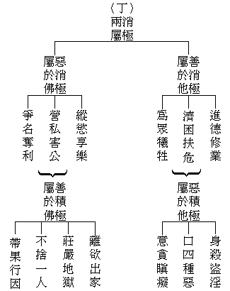 「善消極屬於他」,那些人說學佛的人消極,他自己對於善事不肯做,不肯做就是消極。「進德修業,濟困扶危,為眾犧牲」,這都是好事,他不肯做,可見得他消極。「惡消極屬於佛」,學佛的人也消極,哪些地方消極?「縱慾享受,營私害公,爭名奪利」,學佛人都不要,這消極。他看到我們這一些方面是消極,好像在社會上沒有進取心,不跟人爭名奪利。「惡積極屬於他」:「身殺盜淫」,「口四種惡」就是妄語、兩舌、惡口、綺語,「意貪瞋痴」,這是十惡業。世問人積極在造,這是惡的積極。
