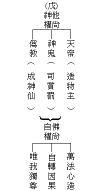 他尚神權,佛法與這個恰恰相反,「佛尚自權」。底下是簡單說明,「萬法心造,自轉因果,唯我獨尊」。釋迦牟尼佛出生時所示現的相,「天上天下,唯我獨尊」。有些外教的人看到這一段經文很不舒服,他說佛教未免太自尊自大,天上天下唯我獨尊,那其餘的人都瞧不起了?這是莫大的誤會。這個「我」不是指我這個人身,這個我是指自性,指真如本性。這個我是講真我不是假我,是指大我不是指小我,小我有什麼好尊貴的?這是一定要搞清楚。唯有真性獨尊,因為真性能現萬法。在唯識裡面排在第一位,唯我獨尊的是第八識,因為第八識以下都是第八識變的,第八識是能變,其餘是所變,能變是尊;可是第八識比起真如本性,那又要差一截。真性才是真我,才是真正的獨尊。