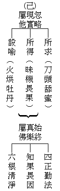 「忽略現實屬他」:佛法是最講現實,絕對不會忽略現實。底下有幾個比喻。現實,一個是「所求」,一個是「所得」。所求的,舉了個比喻,「刀頭舐蜜」;蜂蜜是甜的,但是這個蜜是塗在刀刃上,你要是舌頭去舐,甜味是嘗到,可是舌頭也去了一半。這是忽略現實。所得的,是「昧機畏果」,昧著良心得到以上所求的,可是心不安,怕果報。底下一個假設的比喻,「火烘牡丹」。牡丹花開得很美,稱為富貴花,火烘牡丹,確實有這個事情。唐朝武則天時代,有一些人想討好皇帝,把牡丹放到溫室培養,牡丹開花大概是在三月間,如果正月初一就能看到牡丹花這是吉事;他們就用人工的方法培養,使它在正月開花。但是這個花只開一次,如果讓它自然生長,年年都開花;人工的方法逼它提前開花,它只開一次,以後不會再開花。這是忽略現實。