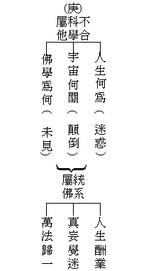 「不合科學屬他」,這裡提出幾個問題。「人生何為」:我們到這個世間來幹什麼的?答不上來,這是迷惑。「宇宙何關」:宇宙、社會、一切人事,與我們有什麼關係?有人說沒有關係,說有關也是說得不懇切,這就是「顛倒」,不得事實。「佛學為何」:佛學是什麼?他「未見」,不明瞭佛學是什麼。每一個問題有正確的答案,這是科學。「統系屬佛」:統系就是科學的精神,佛法是有系統的學術。底下也正是解答這三個問題。
