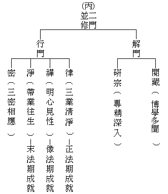除這個之外還有沒有辦法?有。不但近代有,古人也有這種情形,一生專攻一部經,這會有成就;不但是行門要一門深入,解門也要專精深入。在近代,江味農居士一生專攻《金剛經》,花了四十多年的時間鍥而不捨,寫出《金剛經講義》,這個講義就變成金剛經註解的權威。自古以來金剛經的註疏他都看過,這個講義集古今《金剛經》註解的大成。周止菴居士也是如此,一生專攻《心經》,《心經》兩百六十個字,他下了四十多年的功夫,《心經詮注》變成自古以來《心經》註解的權威。這個方法值得我們學習。每一宗的典籍幾十種之多,十年研究二十種,平均半年讀一部,用的功夫很有限,成績平平;如果十年用在一部經上,這不得了,你這一部經必定出人頭地。古人,縱然他是從一宗下手,幾乎到他晚年成就的時候,把拉拉雜雜的都捨掉,最後只留一樣,變成專攻,所以在解門也是一門深入。諸位一定要記住,解中有行,行中有解。著重學術的,像華嚴宗以《華嚴經》為主,天台宗以《法華經》為主,三論宗以《中論》、《百論》、《十二門論》、《大智度論》為主,唯識宗有六經十一論,以《解深密經》、《成唯識論》、《瑜伽師地論》為主,他們也有修行的方法,並不是只解不行。著重在行門上的,也有理解,都是解行並重。