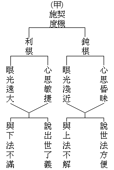 「利根」的人「心思敏捷」,見聞覺知很利,一看他就明瞭,一聽他就懂得,一聞千悟。他的「眼光遠大」,不僅僅是談眼前的事情,他曉得有將來、有來世,他要求更殊勝的果報,要求究竟圓滿的果報。佛遇到這一類的人,「說出世了義」,滿足他。「與下法不滿」:他不求人天福報,他要求究竟圓滿的解脫。