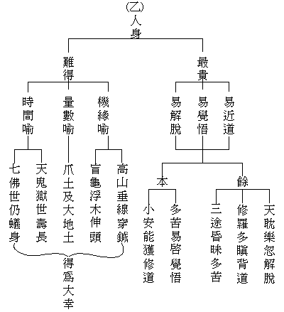 「難得」:人身難得。為什麼難得?底下是佛在經上所說的比喻。「機緣喻」:機緣不容易。第一個比喻,「高山垂線穿鍼」:佛是講須彌穿鍼,須彌山是最高的山,從山上垂一條線下來,山下放一個繡花針,線一掉下來剛好就穿進針孔。你們想想,這個機會有幾成?這是說得人身的機會這樣渺茫,我們是須彌山那條線,恰巧就穿進人道這個針孔,真不容易。第二個比喻,「盲龜浮木伸頭」:瞎眼的烏龜在大海裡,大海裡有個木板,木板當中有個洞,木板在大海裡漂,瞎眼的烏龜頭一伸出來,剛好伸在木板洞裡;這個機會太難得,機緣不容易。佛說的話是聖言量,我們要相信,佛不會欺騙我們的。《金剛經》說:「如來是真語者、實語者、如語者、不妄語者、不誑語者。」我們一定要相信佛所說的,人身不容易得來。在六道裡,神識投到人道確實不容易。