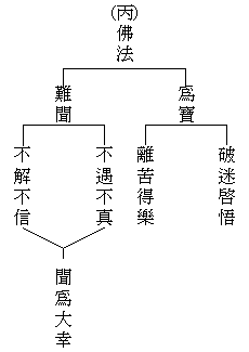 這一段講佛法難聞。聞到佛法是機緣,這個機緣非常難得。今天全世界四十多億人口,有幾個人在一生當中聽到佛法?很難!台北市二百多萬人口,幾個人聞到佛法?聞佛法的機緣實在不容易。「佛法為寶」:佛法有什麼好處?佛法是寶。寶的意思是有用,我們人要是得了財寶,物質生活就不缺乏,可以過很富裕舒適的生活,取這個意思。佛法能幫你「破迷啟悟、離苦得樂」:離的是三界輪迴之苦,得的是究竟之樂;這是我們人生所嚮往的,所追求而追求不到的,佛法裡頭有。「不遇不真」:佛法不容易遇到。我們現在遇到了嗎?未必。遇到的也許是假佛法,不是真佛法。遇到不是真的佛法,跟沒遇到沒有兩樣,不能成就,你跟他學,迷上加迷,苦上加苦,不能解決問題。「不解不信」:遇到真正的佛法不解,《大藏經》看不懂,那也得不到利益。看懂了,又未必相信。有很多大學教授、天主教神父,買《大藏經》在家裡看,研究參考,但他不相信;不信,也是枉然!能信,信了之後又不願意修行,那也不行。信了之後要發願,有願,又不肯行;或者肯行,行了又不努力,進進退退。這樣一層一層的淘汰,剩下來沒幾個人;台灣這麼多人學佛,淘汰下來,剩一百個都不到,豈不是佛法難聞?「聞為大幸」:聞了之後,確實是真的,又能理解、又相信、又發願、又努力的依教奉行,沒幾個人。這是真正要覺悟的,機緣實在不容易,開經偈說「百千萬劫難遭遇」,不止百千萬劫。好不容易得到人身,又遇到正法的機會,這一生不能成就的話,怎麼能對得起自己?甚至對不起佛菩薩,對不起父母師長,對不起一切眾生。