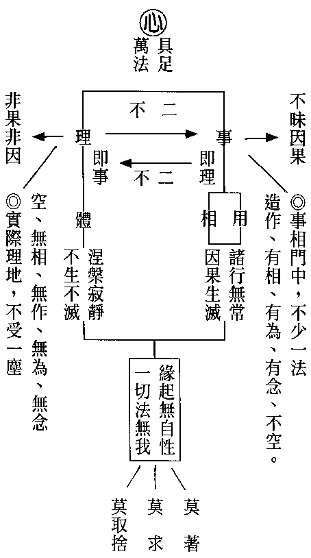 「心」本自具足萬法,不論研究唯識、華嚴(法界緣起、一真法界)、禪(心具足萬法,即心即佛)、淨土(唯心淨土),統統不離此心。關於心性的討論,分事法與理法,偏一不可。就事相或事用上來說,是生滅的,如六根、六塵、六識,眼所見,耳所聞,可感受到的、有形相的東西;就理上來說,則是無形相的。理即事,事相亦不離理體。「法」定要理事圓融,偏理偏事都不究竟也不圓滿。事相來說:不昧因果(意即不能違反因果),無論修行至何等境界,皆不能違背因果。即使開悟,也必須注意身、口、意的造作,何以故?因為不昧困果。事相上,因、緣、果的連鎖性,即使是聖人亦不可壞,必須對因果負責。我們每個人都有佛性,何以相貌和福報卻不同呢?這就是宿世所修的善根不同,而其因果具體反應在事相上所致。可是,理卻無法去講,因為它離語言相,只能方便說。聖者悟到本體界,亦即悟到非因非果。所謂「非因非果」,不是沒有因,沒有果,而是指「因」本身就是空性。非因,意即當下就是空性,非果亦是空性。換言之:聖人悟到因緣果報、任何一個動點上統統是空性,契入此名為頓悟。何時能放下,何時就開悟。就理上而言,若能放下知見和執著,當下就完成佛道。