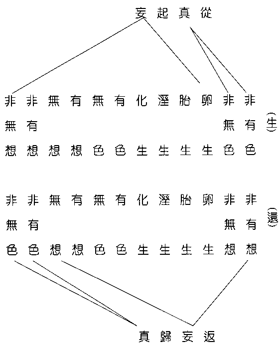 以上四相。乘世界因相而成。相待輪迴。即前文生力發明義。相引輪迴。即前文熏以成業義。合妄輪迴。即前文同業相感義。怨害輪迴。即前文相滅相生義。由此因義已成。接前胎卵等四。即世界現生相也。有色等四。即世界未來相也。以是可知。卵胎溼化。因於非有色等四。非有色等四。又因於有色等四。有色等四。又因於卵胎等四。是為前文聲香味觸。窮十二變。為一旋復。乘此輪迴顛倒相。是有十二類生也。觀此十二類生。似無終始。若依凡夫。則以非有色非無色為始。以有想無想為終。是故凡夫修行。返妄歸真。首斷妄想。即非有想。非無想。不從非有色非無色斷起者。以非有色非無色。是凡夫真因。非可斷。亦無由斷故。乃至有想無想斷時。妄心頓歇。則非有色非無色二生。復成是有所有。若自度住此不進。則名小乘涅槃。若自他俱度。至此則名十回向菩薩。若更向前進。即為登地菩薩。將此有所有融通。復成畢竟無。是為等覺。復以金剛智。斷前所斷之無相盡。是為成佛。此有所有。本是真如。因分而成妄。滅妄故。還成真。是故本經前文說。眾生十類。即依還滅說也。此說十二類。乃依生起說也。金剛經云。若卵生。乃至若非無想。我皆令入無餘涅槃。其中無非有色。非無色二類。即從還滅而說也。或云。十類者。除空散消沉。與精神化為土木金石二類。非。空散消沉。即以空散消沉為生。非不生故。土木金石。亦以土木金石為生。非不生故。又空散消沉。是無色類。土木金石是無想類。經除非有色。非無色二類。彼除與經文不同。是未了十類與十二類不同之要點也。