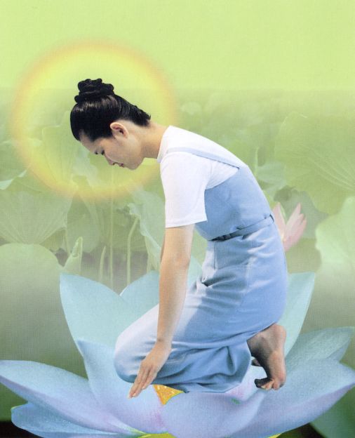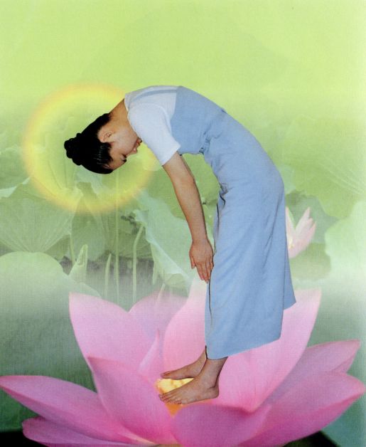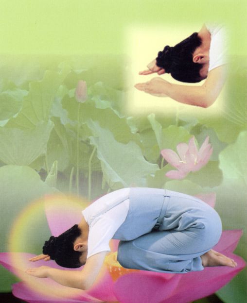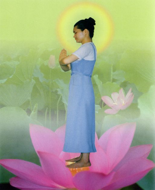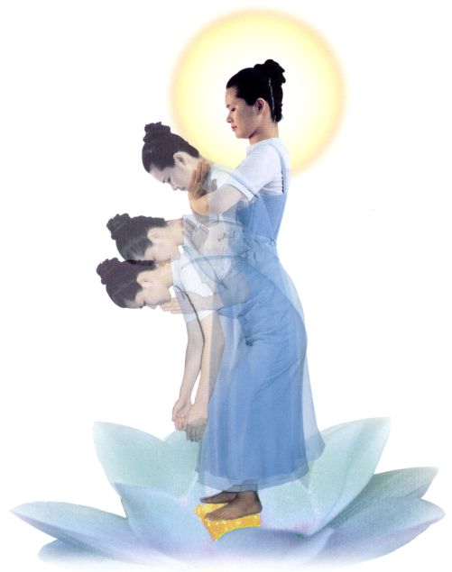 ●在將手掌翻轉向上,如蓮花開,如掏心供佛。〔此表決志轉變自己,向佛學〕。〔翻掌時,盡量「翻平」—使掌心平面向上,〔勿傾斜〕,但勿僵持使力,須立刻放鬆,使手指如蓮花瓣輕柔〕