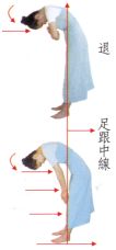 注意:並非向前彎腰〔重心偏於「趾」〕。而是向心躬身〔重心保在「跟」〕。