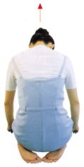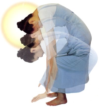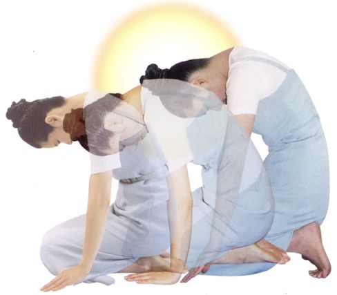 ●垂頭,觀照中心線,觀照自己如何動作。有如要「看自己足跟」般之動作。如仰臥起坐之用力方式,令「心口—腹—腿—膝」一起退後,使脊椎向後拱起。〔腹「臍」可退一尺〕。而手臂鬆、不動。