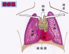 •一般人或許不知道我們胸口內有一「胸腺」之構造,是重要的免疫「淋巴器官」,(部位約如下圖示,有時可大至伸入頸之基部)。我們的身體,有警衛般的系統,體內「T淋巴球」就是重要的警官,它們會打退入侵的外物,也會吞掉(或感化)體內的「太保流氓」(分裂錯誤的細胞—如癌細胞等)。「T淋巴球」就是在「胸腺」製造。胸腺,可以分泌出「胸腺素」,使T淋巴球分化好、發育好(武功高強)。若精神壓力大,胸腺會萎縮,功能差,手若壓在胸口,也會使胸部受壓大,氣血不通。