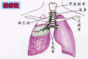把「右肺」橫切,顯示出「橫斷面」(約在支氣管高度),綠色如細樹枝之線條,表示密密麻麻「小淋巴管」,收集淋巴液,(參考後面章節)進入較大的淋巴管(圍繞氣管小分枝),再匯入「淋巴結」(綠色球),注意淋巴結在中央氣管二旁,且「胸骨」二旁亦有之,(「胸骨」—見後面章節)若壓迫胸部,易阻淋巴回流,淋巴最後送回靜脈(鎖骨下方)。