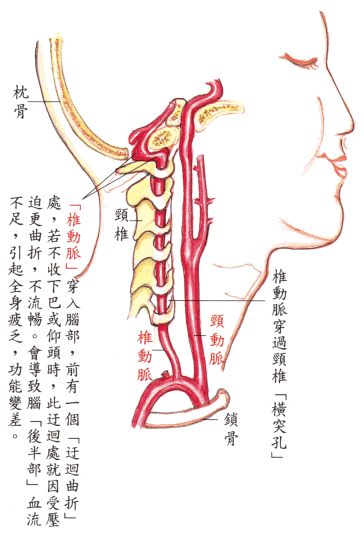 觀察此椎動脈,既穿在頸椎「孔」中,就隨頸椎變形。頸椎曲折,它也曲折。且它在入腦之前,先天上有一迂迴曲折。(如圖)