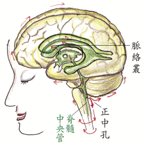 (圖中以草綠色表示腦脊髓液) (紅色箭頭表示其流動方向) |