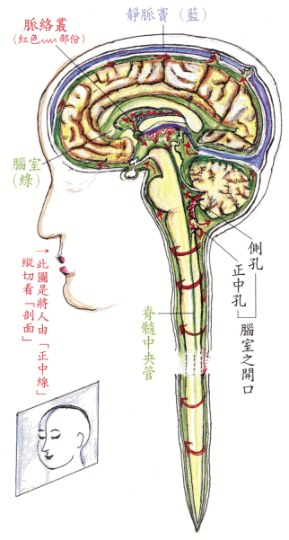 圖中綠色■部份代表「腦室」是個立體的腔室,夾在腦中其中充滿了液體,液體是由腦室中的「脈絡叢」(見左頁圖)滲出,如箭頭↑↓方向流動,由「正中孔」流出,又包圍循行於整個腦及脊髓「外圍」和中央管,如下圖所示(綠色部份),然後回收入「靜脈竇」(位於頭頂正中線),回收入血液。
