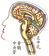 *如下圖,以縱剖面看腦部,可見藏在其中的「腦室」構造及「脊髓中央管」,以及由「腦室」之開口,循行到整個腦脊髓外層的「腦脊髓液」。