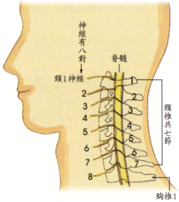 頸椎各節神經之供應部位及頸椎各節有壓迫時之現象、症狀。