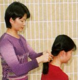 ←雙手交叉,輕鬆放在頭(枕骨)後方,垂頭、放鬆。以手之重量,載於枕部,調整拉開頭、頸之關節,(枕寰關節),及頸椎各節。 |