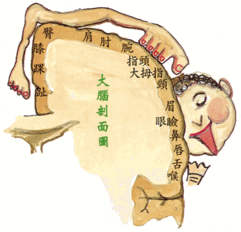 1、如下圖,越是末梢細微精密活動,越屬高層腦部管轄。各種動物都難以有像人類般的手指活動,(圖上可見管手指活動之管轄區,在腦中佔特別大的比例),尤其「小指」和「心的專注程度」有密切關係。
