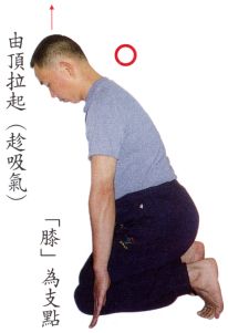 因下一個動作是翻腳準備起立,此動作之支點是在「膝蓋」,故雙手若先收到膝旁時,則頭、肩、手整個上身,重量也正好會落在膝蓋間。如此,重心穩固(一心、無二心),全身方可輕鬆、靈活翻腳。