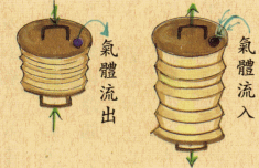•我們吸氣時,猶如「拉風箱」。(我們人體的風箱,就在「胸腔」。)靠著拉大風箱體積,使風箱內壓力變小,外面空氣自然向「壓力小處」流入,形成了充氣(猶如人體吸氣情況)(下右圖)。而壓縮風箱體積,內部壓力就變大,大於外界氣壓,則氣體就流出(猶如呼氣狀況)。(下左圖)