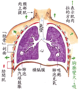 下圖表示: 胸廓肌肉拉動—胸腔變大變小,和肺、呼吸的關係。(剖面圖) |