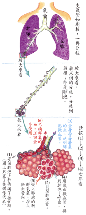其實肺中充滿了密密麻麻小肺泡(約六億個)直徑約0.14mm,如果總計肺泡的表面積,大至六十平方公尺,幾乎可舖滿一個網球場。肺泡群聚如空心葡萄,上覆滿了「血管網」(如葡萄皮上的脈絡),肺泡壁和血管網可以互相交通,血中廢氣,透過肺泡壁—呼出;新鮮氧氣,透過肺泡壁—滲入血管—供應全身。