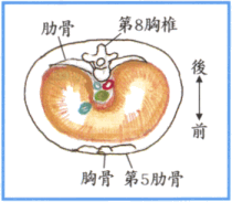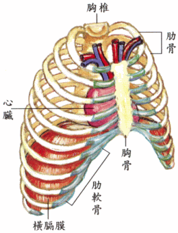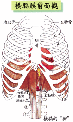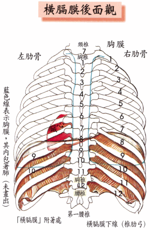 由背面看「橫膈膜」,圖中顯示它和肋骨、脊椎、心臟之相關位置,可看出下緣之附著部位。 |