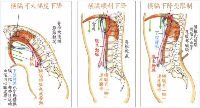 跪伏之動作時,可消除「腰椎前塌」對橫膈運動之障礙,而且因橫膈膜下緣的「腳」,附在腰椎上,故當腰椎「後拱」—就連帶拉動橫膈膜。而腰椎「後退」—同時也使橫膈膜可充分往腹部降下去,而不受「腰椎前塌」之障,則肺可充分往下膨脹充氣。